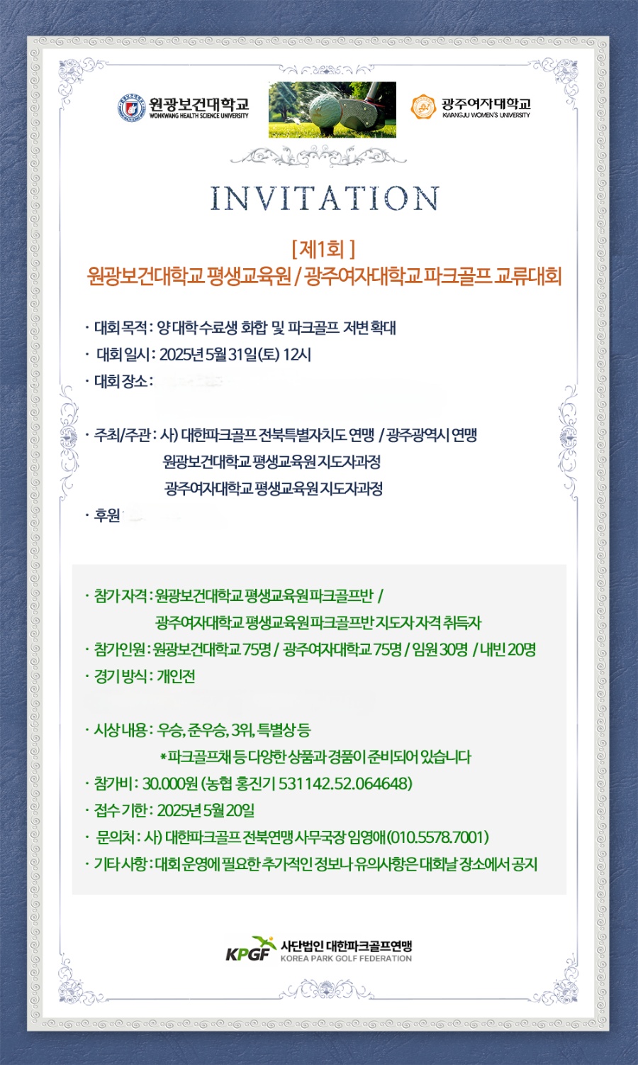 공지사항 원광대학교평생교육원 파크골프지도자 친선대회 작성자 : 최고관리자 작성일 : 25-05-06 11:39 조회수 : 2,844회 1 다음글 경기도파크골프연맹 전국대회 25.04.24 이전글 2026년 대경대 레저파크골프학과 모집요강 25.06.05 목록