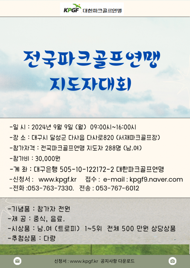 공지사항 2024전국파크골프연맹지도자대회 작성자 : 관리자 작성일 : 24-07-08 11:15 조회수 : 4,154회 첨부파일 대회 신청서.hwp (33.5K) 안녕하세요 대한파크골프연맹 사무국입니다. 신청시 신청서가 보이지 않거나 다운이 안되실경우대회안내에 보시면 전화번호가 있으니 전화해서 신청하셔도 됩니다. 감사합니다. 다음글 2024년도 전국 혼마대회를 개최합니다. 24.07.02 이전글 2024 연맹전국파크골프대회일정 24.07.08 목록