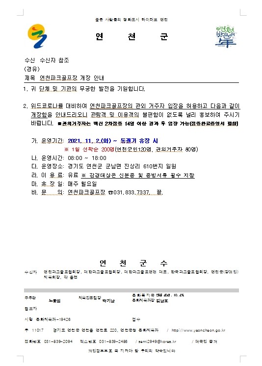 공지사항 경기도연천군파크골프장 개장 작성자 : 관리자 작성일 : 21-10-25 18:20 조회수 : 4,390회 1 다음글 체육진흥법 / 갑질신고센터 21.10.10 이전글 11월20일 혼마선수권대회 시상결과 21.11.22 목록