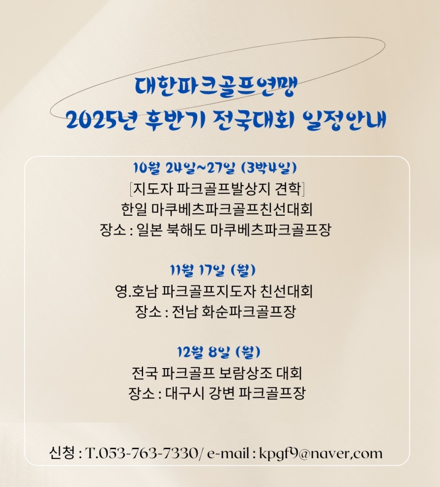 공지사항 연맹 2025년 하반기 전국대회 일정 작성자 : 최고관리자 작성일 : 25-07-01 18:37 조회수 : 3,205회 2025년 하반기 전국대회 일정입니다. 다음글 파크골프발상지견학/ 한일파크골프친선대회 25.06.30 이전글 2025 영호남파크골프지도자친선대회 25.07.21 목록