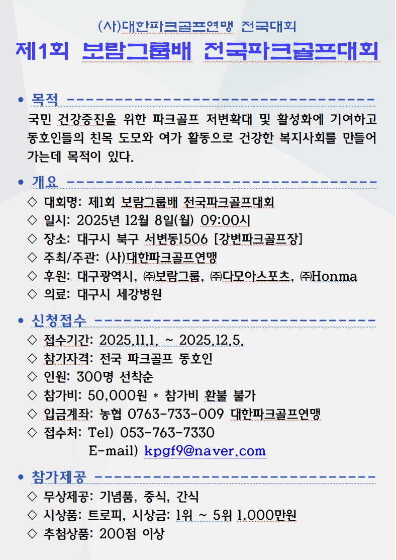 공지사항 제1회 보람그룹배 전국파크골프대회 작성자 : 최고관리자 작성일 : 25-11-06 11:32 조회수 : 2,120회 대회 신청 마감되었습니다. 성원에 감사드립니다. 다음글 전국화순파크골프친선대회 25.10.13 이전글 제1회 보람그룹배 전국파크골프대회 대회 진행 요강 25.12.04 목록