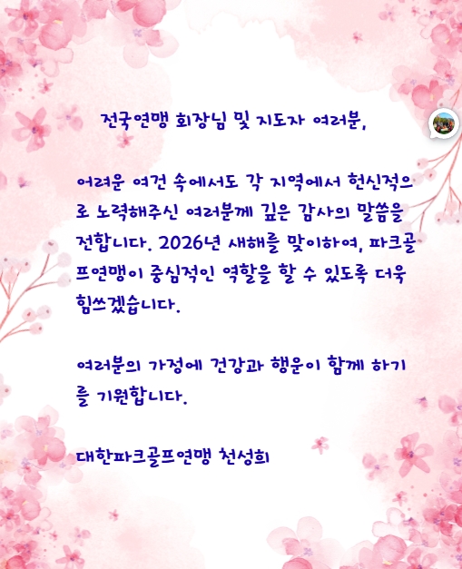 공지사항 새해인사 작성자 : 최고관리자 작성일 : 25-12-31 21:43 조회수 : 778회 1 다음글 2026 국제파크골프 한일친선 교류대회 25.12.26 이전글 연맹2026년전국파크골프대회계획표 26.02.10 목록