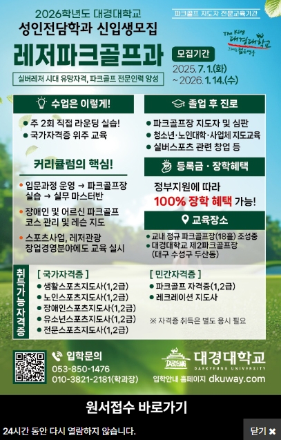 자유게시판 대경대학교 레저파크골프과 2026년 신입생모집 작성자 : 최고관리자 작성일 : 25-07-10 22:55 조회수 : 1,083회 1 다음글 일본마쿠베츠 파크골프한일교류대회 25.07.10 이전글 파크골프의 그림자 25.10.13 목록