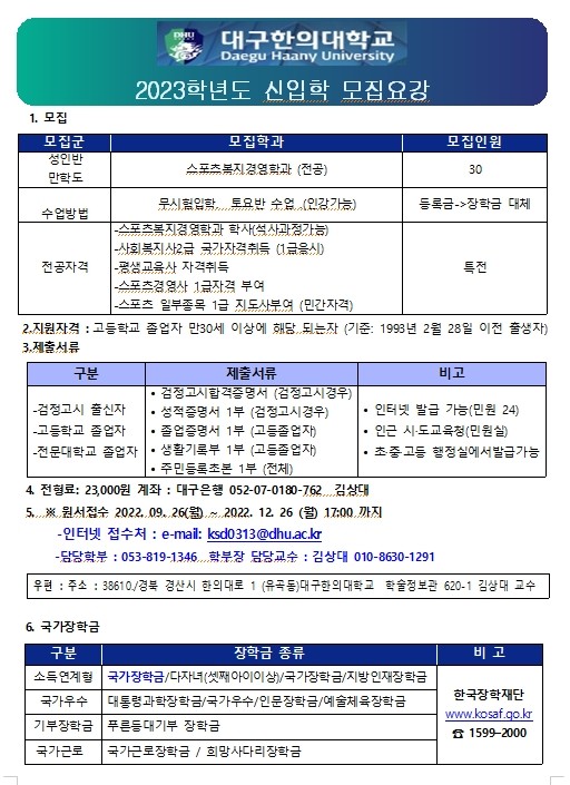 전국연맹소식 2023 대구한의대스포츠복지경영학과모집요강 작성자 : 관리자 작성일 : 22-11-18 04:19 조회수 : 3,042회 첨부파일 2023 정시 원서양식.hwp (159.0K) 1 다음글 제9회전국파크골프혼마선수권대회결산표 22.11.18 이전글 2022. 12.14 대한파크골프연맹 임원총회 22.12.18 목록