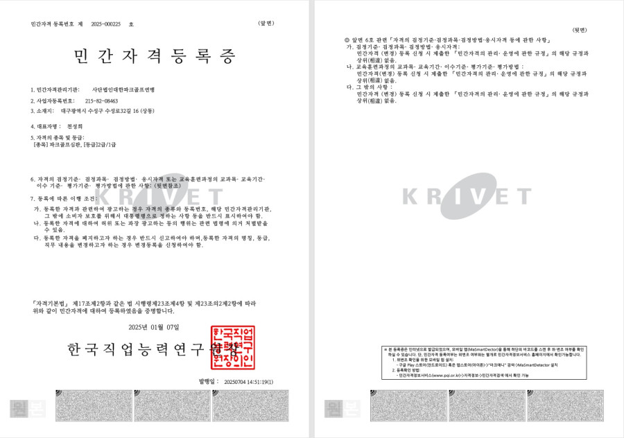 지도자자격정보 (사)대한파크골프연맹 민간자격 등록증 - 파크골프심판 1급/2급 작성자 : 최고관리자 작성일 : 25-07-04 15:12 조회수 : 1,574회 파크골프심판 1급/2급 다음글 (사)대한파크골프연맹 민간자격 등록증 - 파크골프지도자 1급/2급/3급 25.07.04 이전글 파크골프장 공인인증시설 규정 25.07.10 목록